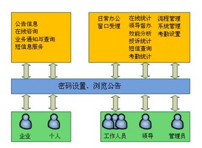 系統(tǒng)平臺(tái)提供外網(wǎng)功能,通過(guò)與因特網(wǎng)的信息交換,建立政府與企業(yè)和社會(huì)公眾之間網(wǎng)上行政審批與監(jiān)察的通道,實(shí)現(xiàn)網(wǎng)上咨詢(xún)、查詢(xún)、申請(qǐng)、審批、投訴、監(jiān)督等業(yè)務(wù)功能;成為真正的網(wǎng)上辦公、辦事的在線(xiàn)服務(wù)平臺(tái),拉近了企業(yè)、居民與政府部門(mén)間的距離,強(qiáng)化政府形象。
