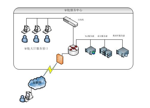 3、“審批服務(wù)中心”局域網(wǎng)與客戶(hù)通過(guò)外網(wǎng)進(jìn)行互聯(lián)。